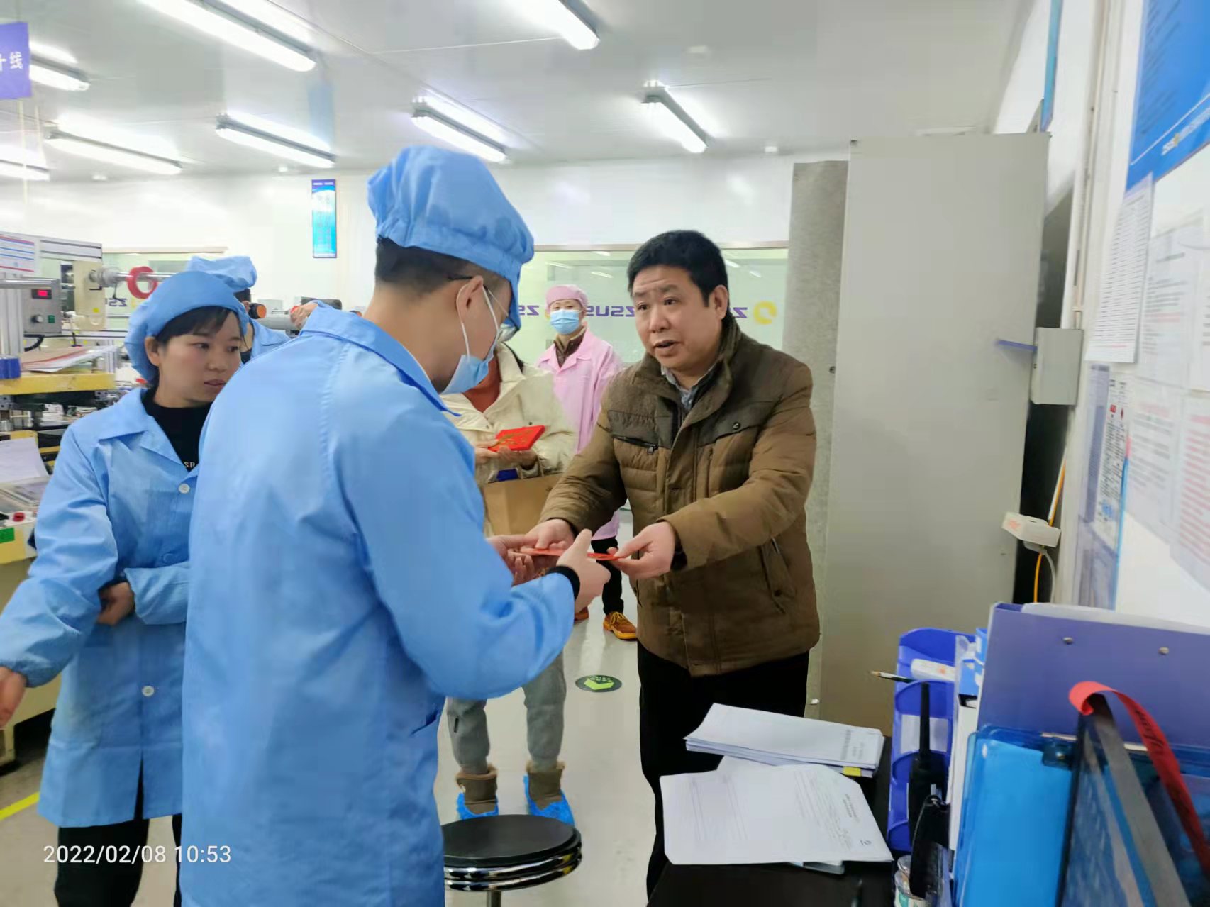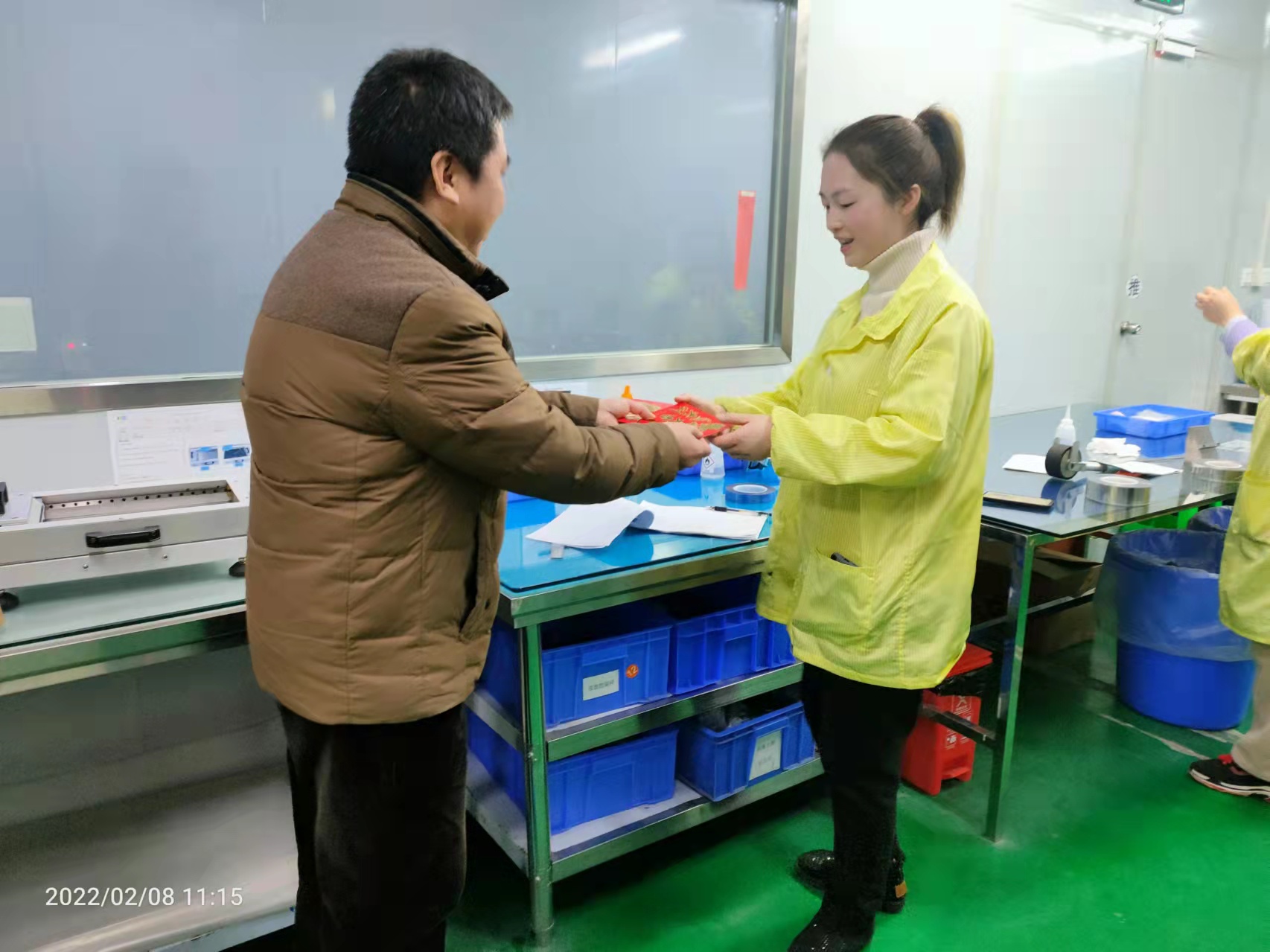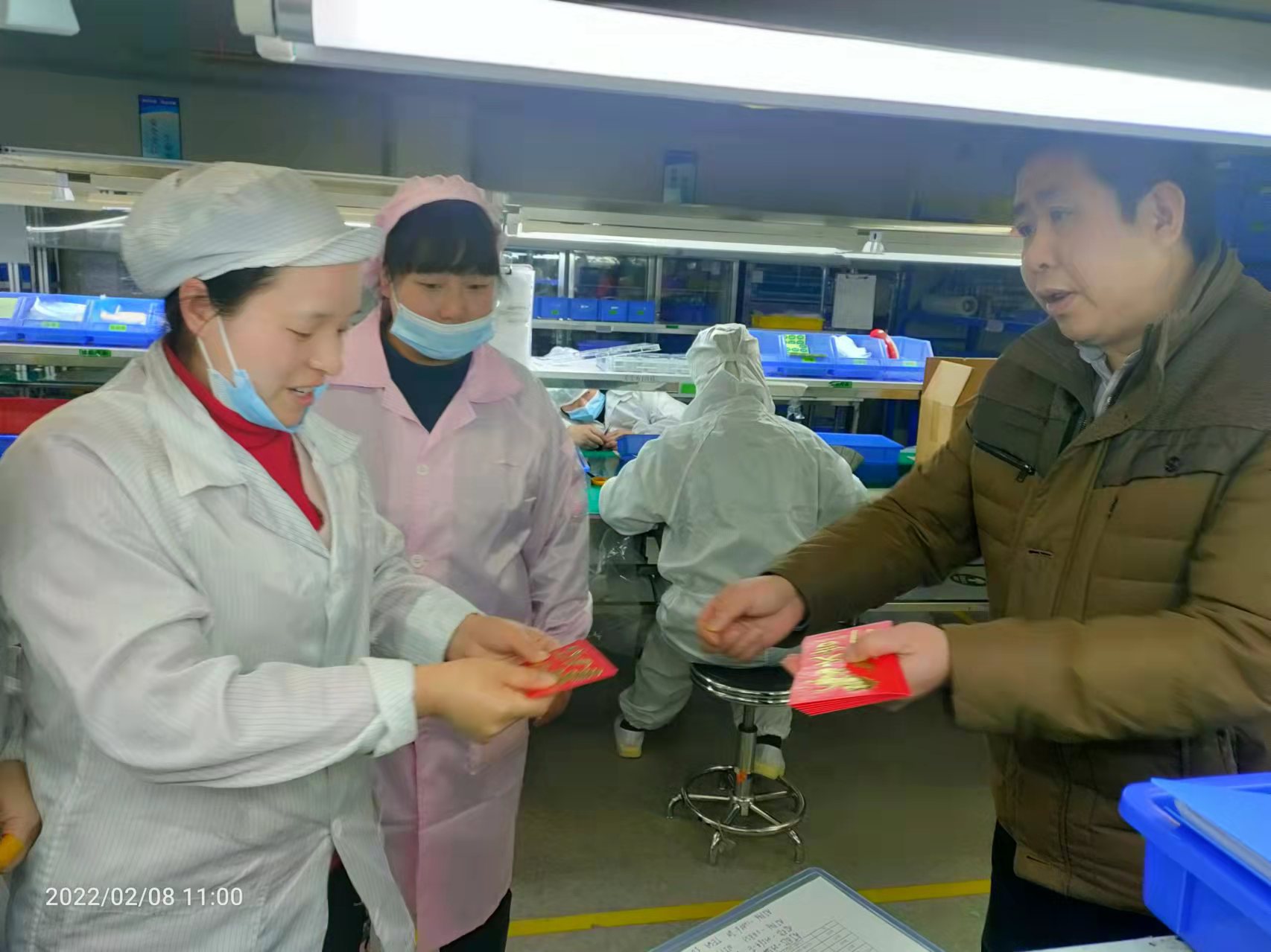 开工第一天,正硕科技一年一度的开工红包也开始火热发放。财务部张经理和行政人事部刁经理一行来到各个车间以及办公室,将吉祥红包和暖暖的新春祝福一起送到今天到岗的员工手中。正在认真工作的员工们一抬头,满脸惊喜,双手接过红包,也连连道着新年快乐。大家都笑意盈盈、喜气洋洋、元气满满!